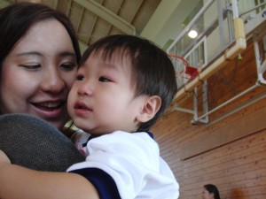 ママに抱っこされて安心したのかやっとで泣き止んで笑顔を見せるようになりました。